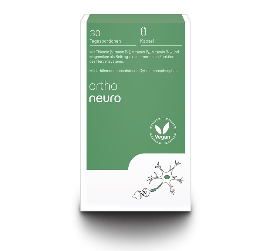 Orthoneuro kombiniert UMP und CMP mit ausgewaehlten B-Vitaminen und Magnesium. Vitamin B1, Vitamin B6, Vitamin B12 und Magnesium tragen zu einer normalen Funktion des Nervensystems bei.